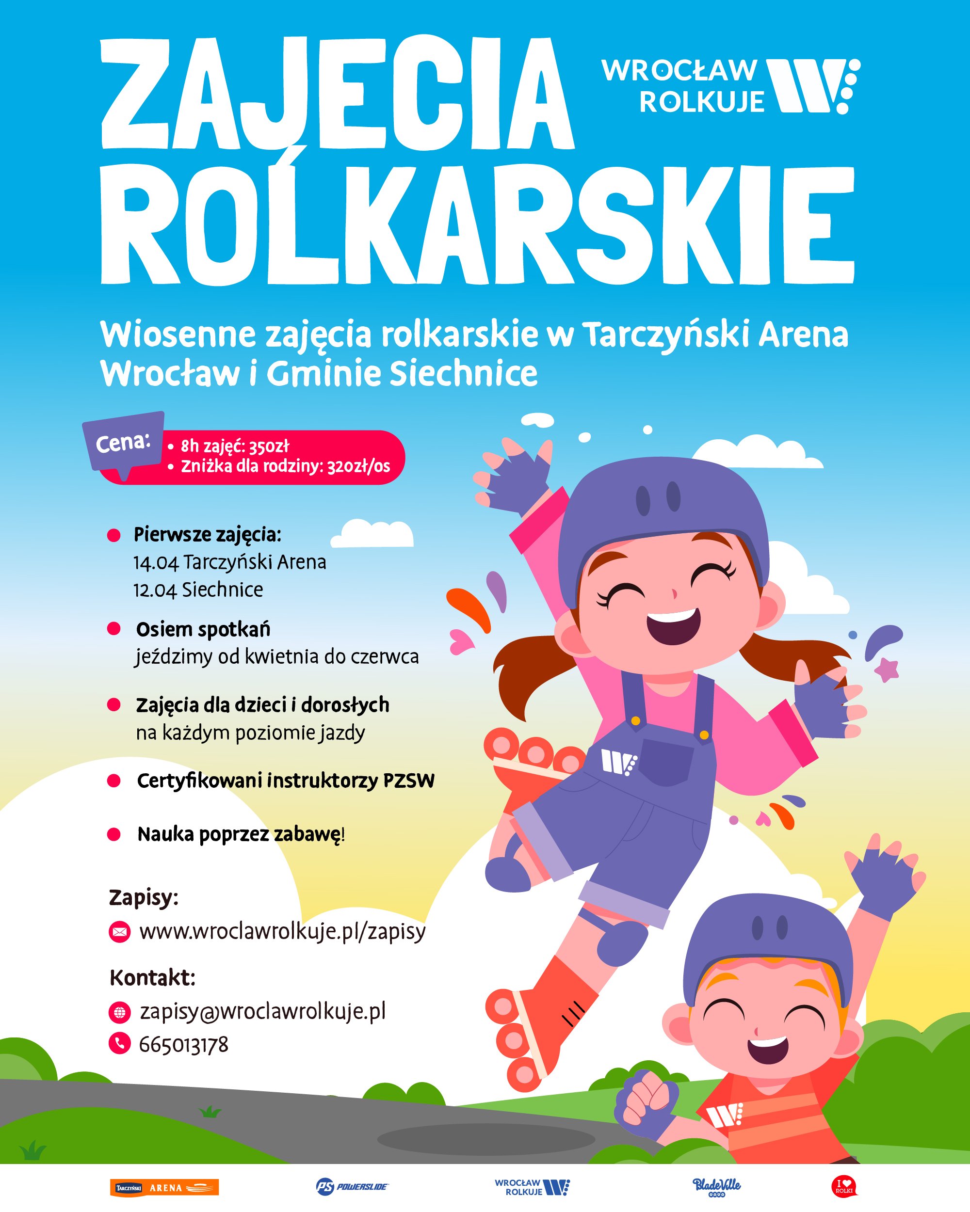 Serdecznie zapraszamy na naukę jazdy na rolkach. Jesteśmy szkółką rolkarską, działającą nieprzerwanie od ponad 7 lat. W sezonie wiosenno-letnim nasze zajęcia odbywają się we Wrocławiu w Tarczyński Arena oraz w gminie Siechnice.