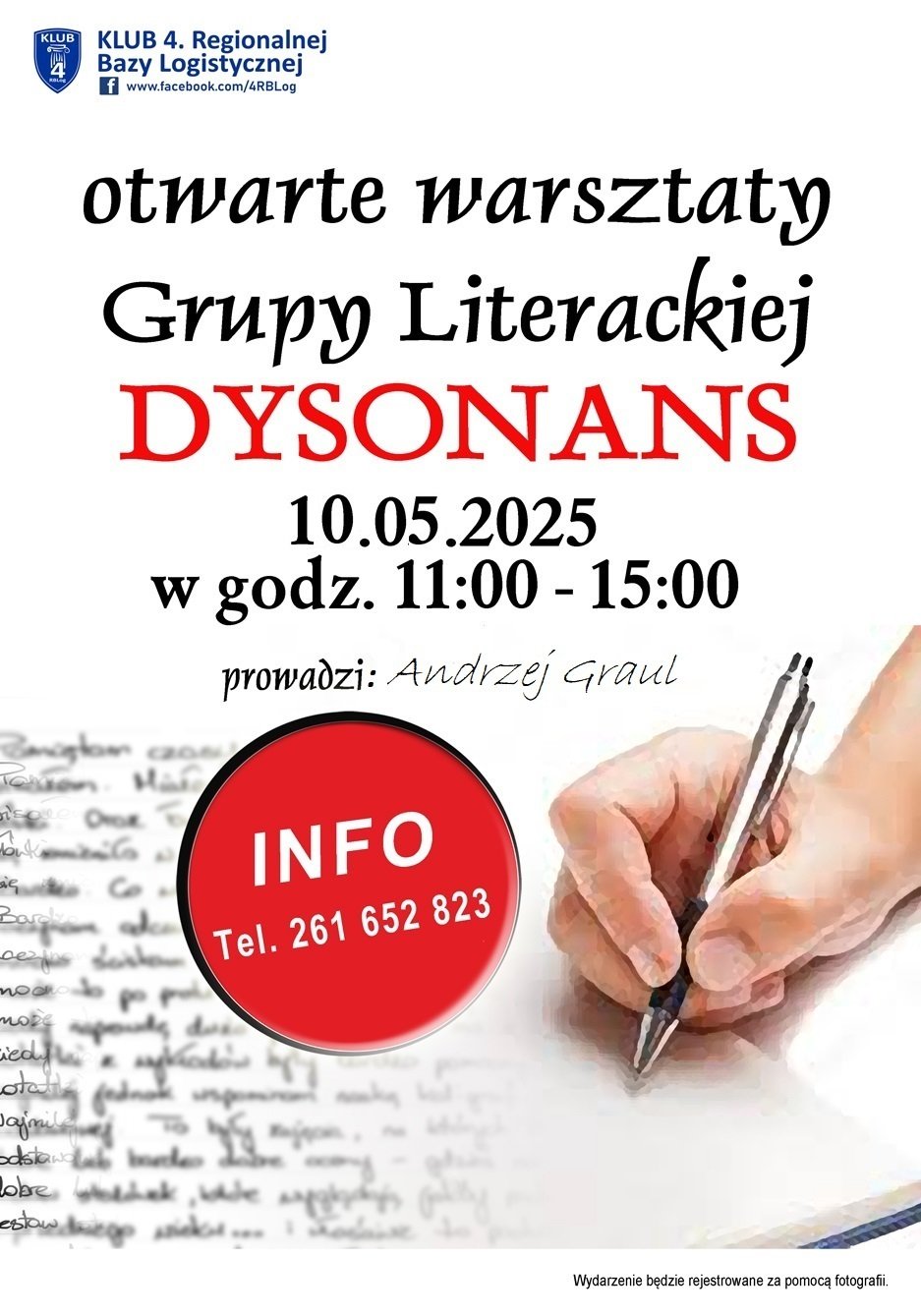Otwarte warsztaty literackie dla dorosłych pasjonatów poezji i prozy, z możliwością dołączenia do Grupy Literackiej DYSONANS.