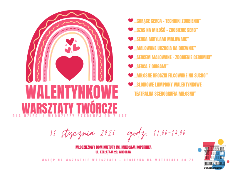 Młodzieżowy Dom Kultury im. Mikołaja Kopernika zaprasza na Walentynkowe Warsztaty Twórcze, które odbędą się 31 stycznia 2026 (sobota), w godz. 11:00–14:00.