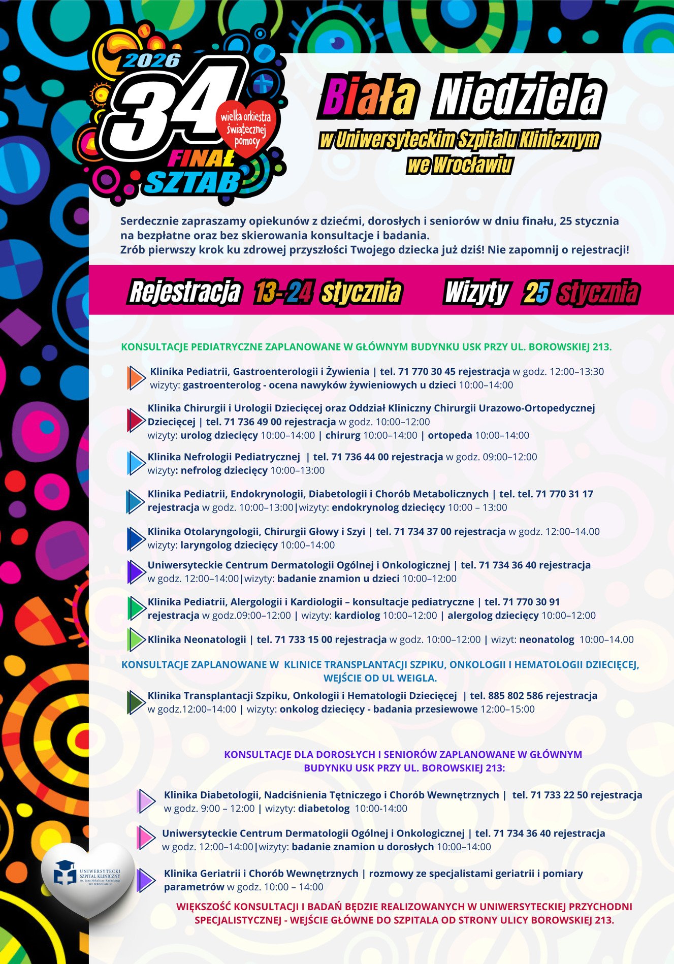Plakat Biała Niedziela dla najmłodszych i ich najbliższych – konsultacje i badania na 34. Finał WOŚP w USK Uniwersytecki Szpital Kliniczny we Wrocławiu