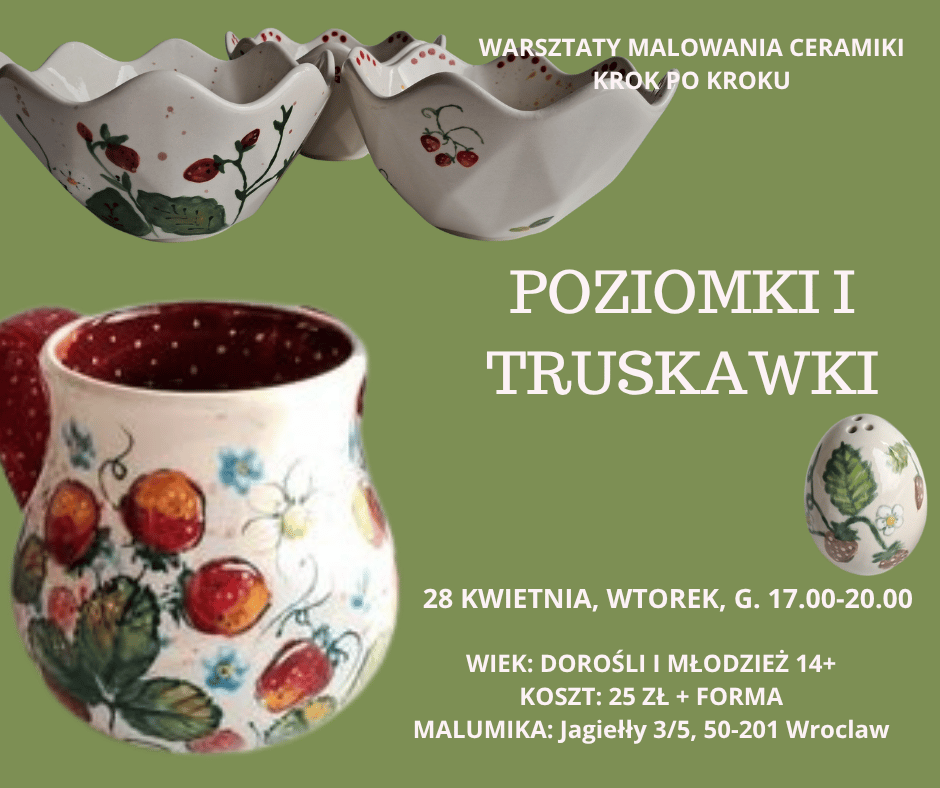 Powracamy więc z warsztatami, podczas których krok po kroku, pod okiem lokalnej artystki, nauczycie się malować gałązki, liście i czerwone truskawkowe piegi, od pierwszego szkicu aż po drobne detale.