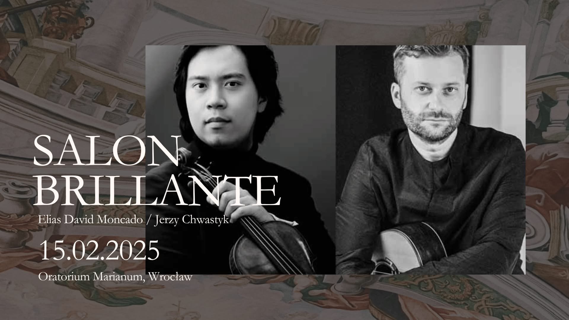 Zapraszamy na wyjątkowy koncert „Alma Concerts — Salon brillante” w zabytkowym Oratorium Marianum Uniwersytetu Wrocławskiego, który, na wzór paryskich salonów Romantyzmu, przeniesie słuchaczy do muzycznych salonów XIX wieku! W roli głównej wystąpi wybitny skrzypek Elias David Moncado, uznany za jeden z największych talentów swojego pokolenia, oraz Jerzy Chwastyk – „poeta gitary”, jak opisuje go magazyn Crescendo. Artyści wykonają pełen emocji program inspirowany romantyzmem, gdzie zabrzmią dzieła takich kompozytorów jak Chopin (w aranżacji na gitarę solo), Ysaye, Paganini, Saint-Saëns i monumentalna Chaconne J.S. Bacha.