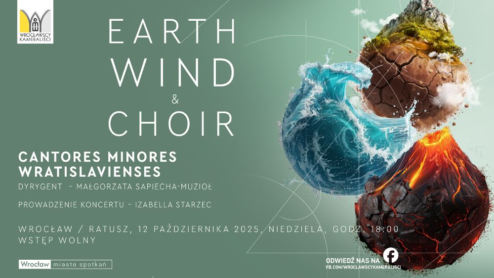 Wrocławscy Kameraliści zapraszają na niezwykłą muzyczną wyprawę, która poruszy wszystkie zmysły. Earth, Wind & Choir” to więcej niż koncert to hołd dla piękna i potęgi natury, opowiedziany językiem chóralnej muzyki. Przygotuj się na podróż przez dźwiękowe pejzaże inspirowane siłami, które kształtują nasz świat: ziemią, wiatrem i wodą.