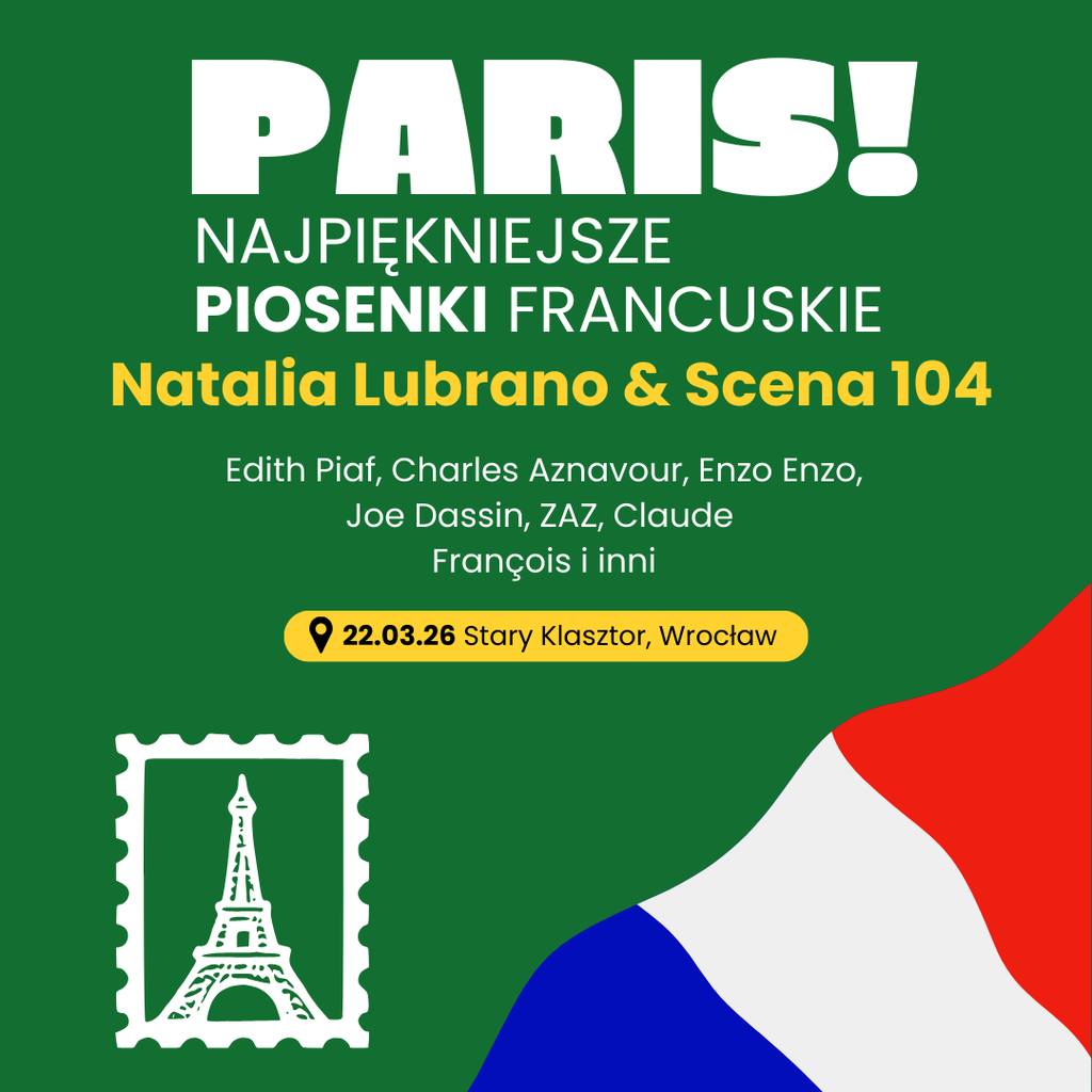 Tego wieczoru z pewnością nie zabraknie czułych emocji i wzruszeń, a powrót do kultowych utworów znad Sekwany, zachęci nas do romantycznej zadumy, chwili uśmiechu czy wspaniałych wspomnień. SCENA 104 to projekt artystyczny założony przez muzyka Tomasza Imienowskiego. Scena 104 promuje cenne inicjatywy muzyczne, literackie oraz teatralne.