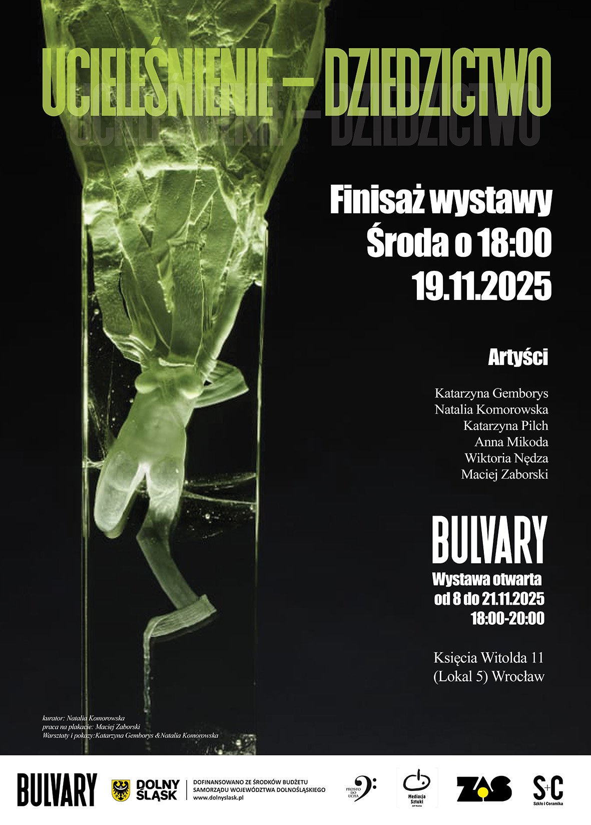 - 19 listopada 2025, godz. 18:00 Finisaż wystawy Pokaz szkła na gorąco w ogniu palnika Natalia Komorowska & Katarzyna Gemborys Spotkanie autorskie z artystami z promocją publikacji Ucieleśnienie—Dziedzictwo