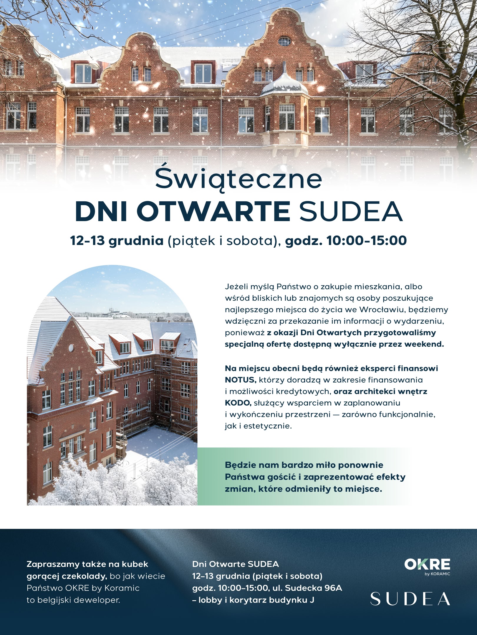 Plakat Świąteczne Dni Otwarte apartamentów SUDEA OKRE